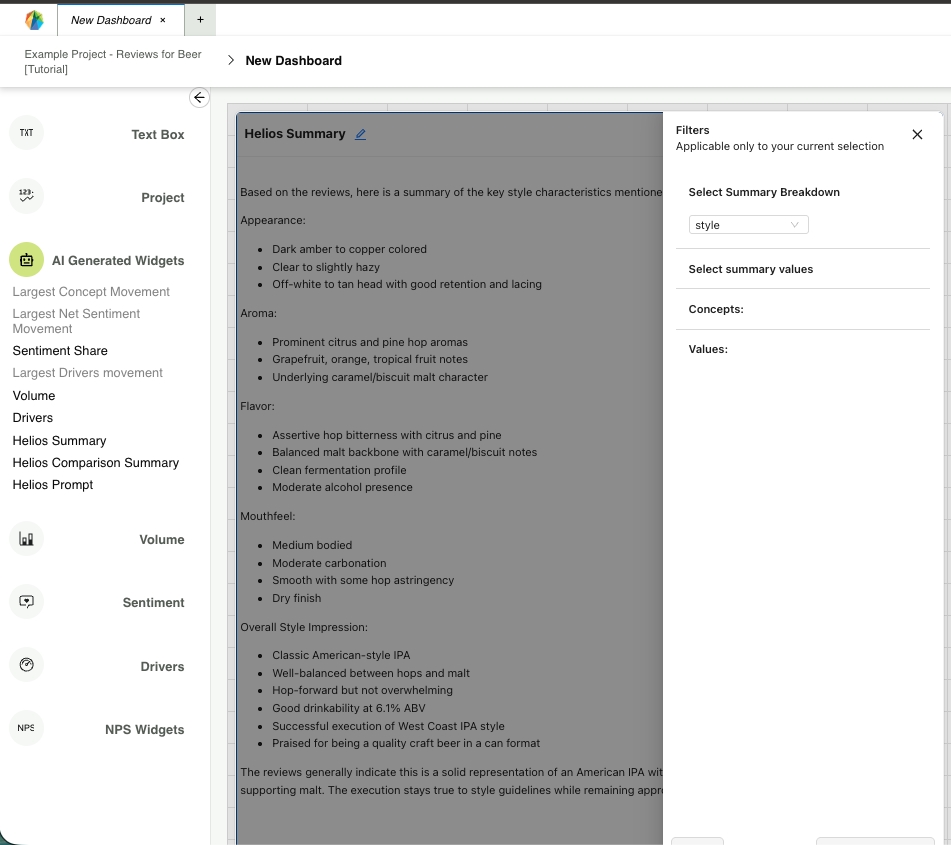 The dashboard offers a wide variety of widgets to enable your analysis, categorized by function. Open the “AI Generated Widgets” section to find the Helios Summary widget. Go to the filters by clicking on the icon in the top right of the widget to “Select Summary Breakdown.” This will summarize the data with the lens of the metadata field selected.
