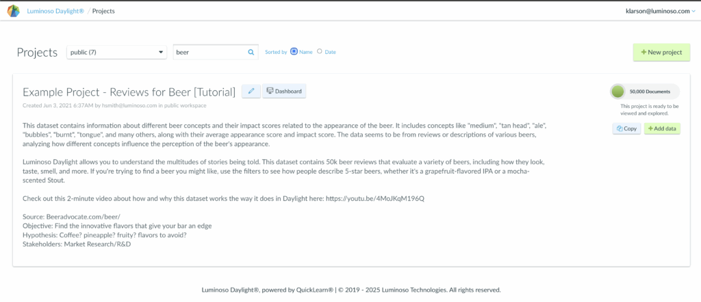 From the project list page, use the search bar at the top to find the “Beer” project, containing 50,000 documents.
